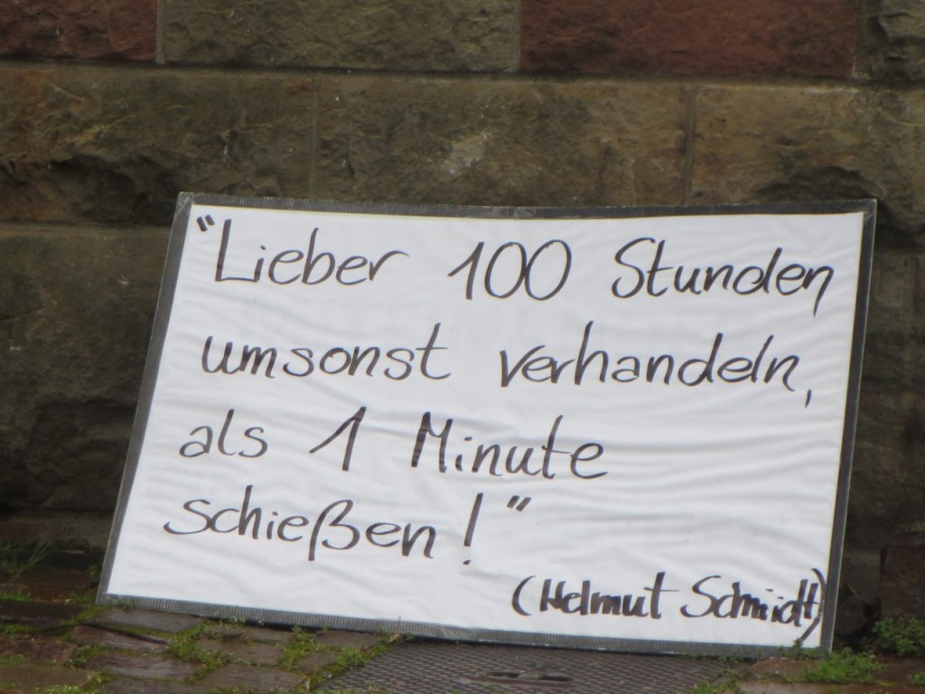 Herzlichen Dank, dass Ihr (bei diesem Wetter) gekommen seid, um für alle sichtbar Euren Wunsch nach Frieden mitzuteilen. Vielen Dank, dass Ihr den Mut habt, dies öffentlich zu tun, trotz unzähliger Kritik und teils wildem Framing in der Presse und den Sozialen Medien.