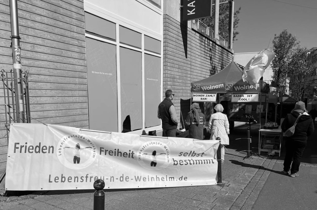 Wir hatten zwar nicht den angemeldeten „Platz an der Sonne“, aber wir hatten viele gute und interessante Gespräche und auch kontroverse Dialoge. Viel Zustimmung, auch Dankbarkeit, aber auch Ablehnung, und entgegen gesetzte, andere Meinungen wurden ausgetauscht! Genau so sollte es immer sein in einer offenen Gesellschaft, in einer wahrhaftigen Demokratie. Danke Weinheim! Danke Lebenfreu(n)de!
