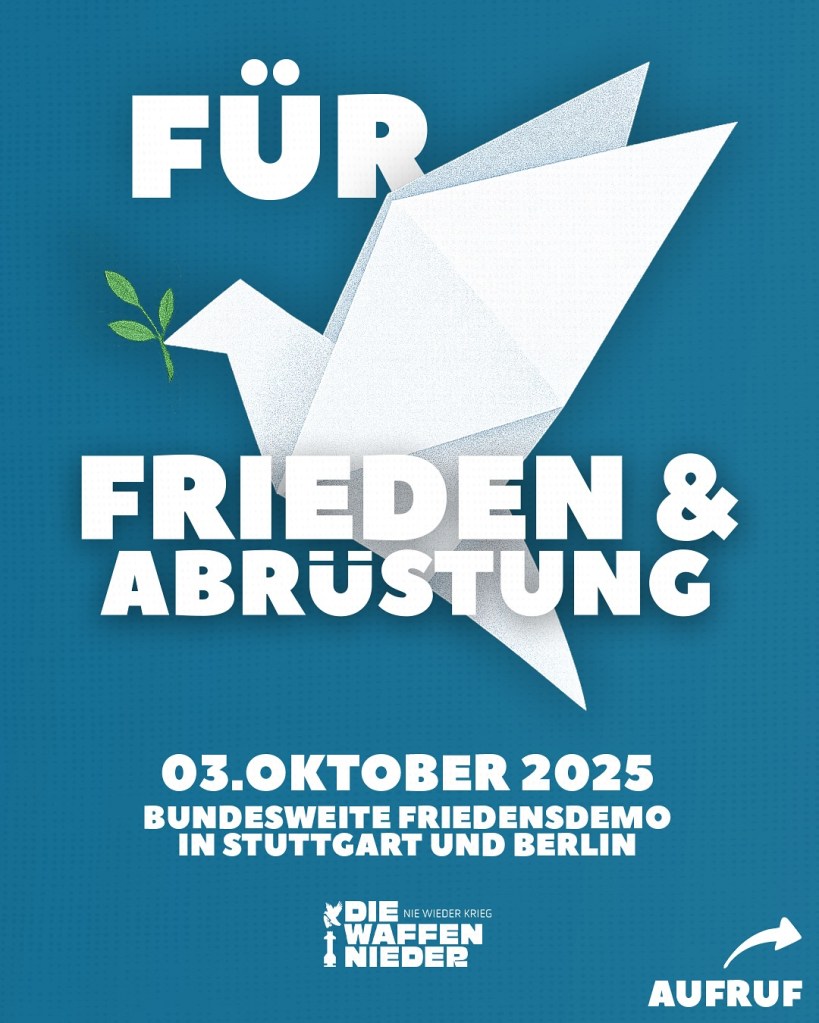 Der Vorbereitungskreis „Nie wieder kriegstüchtig! Stehen wir auf für Frieden!“ hat sich auf einen gemeinsamen Aufruf für Friedensdemonstrationen am 3. Oktober 2025 in Berlin und Stuttgart verständigt. Dieses Bündnis ist entstanden aus der Initiative „Nie wieder Krieg – Die Waffen nieder!“ und einem Aktionsbündnis innerhalb der Friedensbewegung, an dem u.a. ICAN, DFG-VK, IPPNW, Netzwerk Friedenskooperative, Ohne Rüstung Leben und pax Christi beteiligt sind.